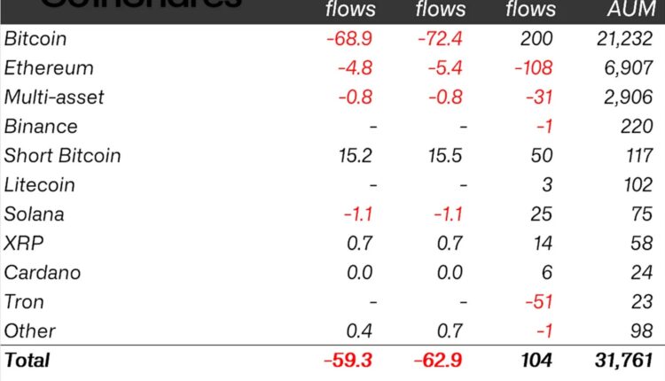 Bitcoin experienced the bulk of activity last week, with its $68.9 million in outflows offset by Short Bitcoin inflows in the amount of $15.2 million and $0.7 million from XRP.