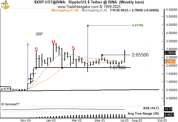 In his latest XRP chart update, Brandt highlights a “highly rare continuation compound fulcrum” setup forming on the XRP/USDT weekly price chart, asserting that its resolve could push the pair up by around 60% to $4.47.