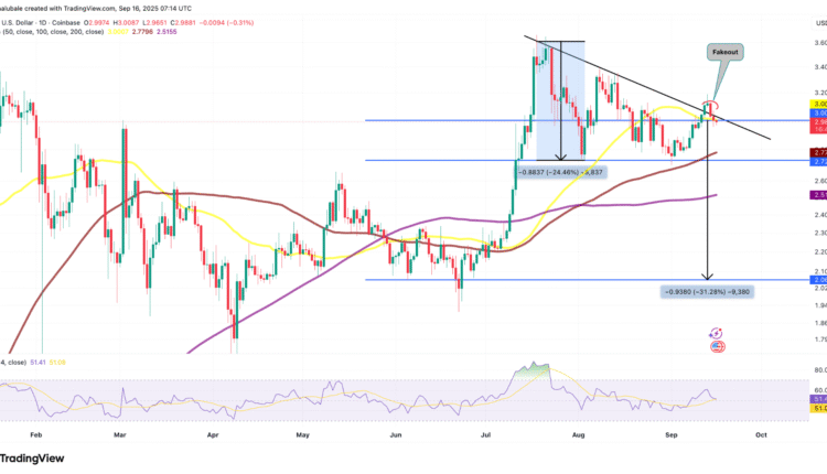 The recent breakout above the triangle’s upper trendline turned out to be a fakeout as bulls struggled to keep the price above $3, signaling a lack of strength.
