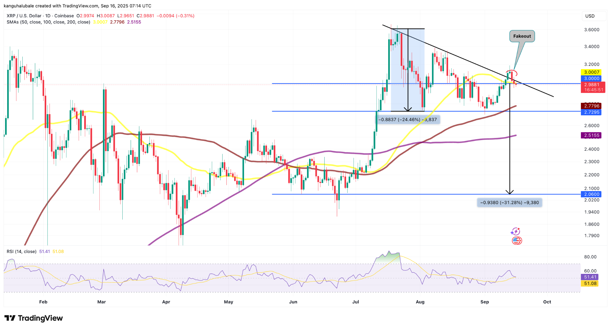 XRP’s failure to hold $3 points to a continued downside risk to $2.40-$2.