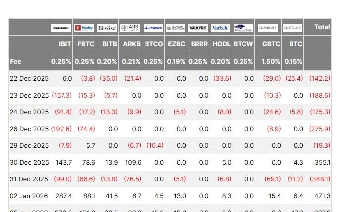 Spot ETH ETFs recorded a similar pattern. The funds posted inflows of $174 million on Jan. 2, $168 million on Monday, and $114 million on Tuesday before Wednesday’s $98 million in outflows.
