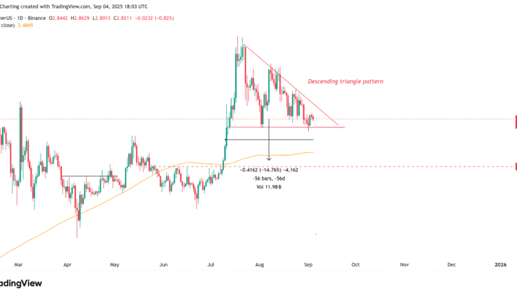 XRP (XRP) price fell by nearly 20% over the past 45 days, continuing a correction that has pushed the price back toward a key support. On the daily chart, XRP is consolidating within a descending triangle pattern, raising the risk of another move below support at $2.70.