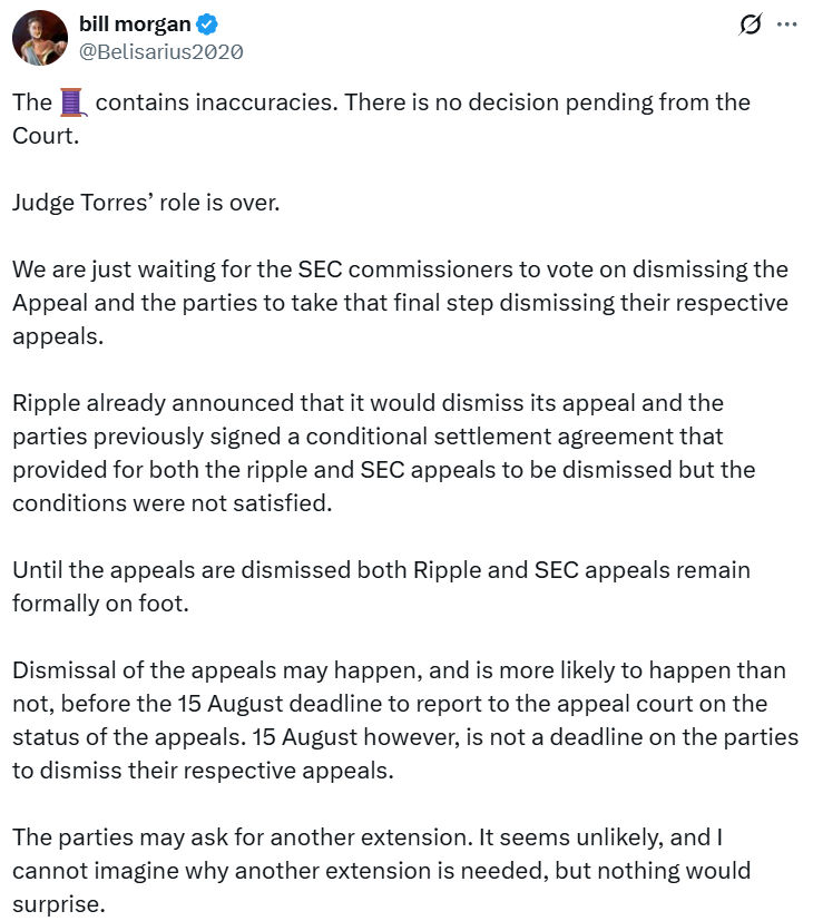 A recent post from lawyer Bill Morgan on X predicted that the SEC may vote to dismiss the appeal before the Aug. 15 deadline.