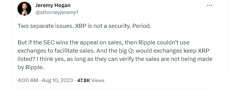 According to crypto lawyer Jeremy Hogan, the two issues are separate. Hogan explained that if the SEC wins the appeal on the sales, Ripple would not be able to facilitate sales using exchanges. Despite this, the lawyer believes that exchanges could keep XRP listed as long as the sales are not made by Ripple.