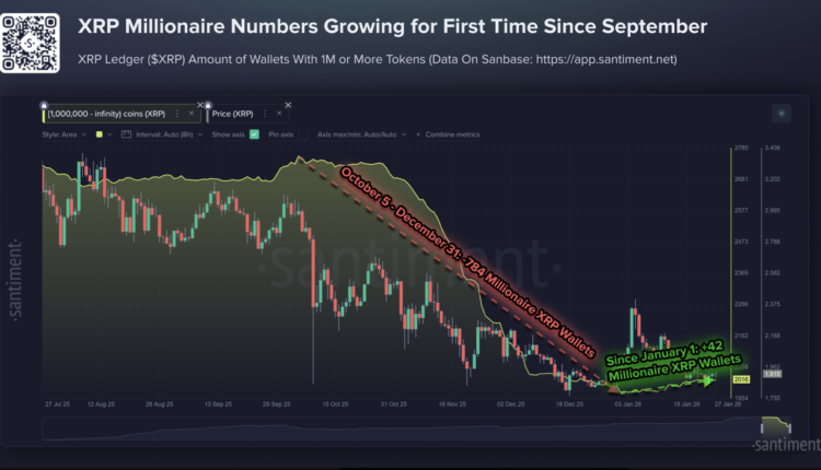 “XRP’s price is down a modest -4% since the start of 2026, but its amount of ‘millionaire’ wallets are rising for the first time since September,” Santiment said in a post on Wednesday.