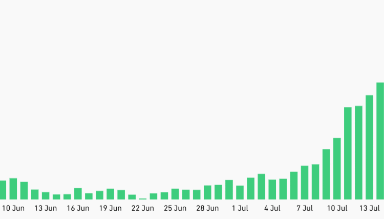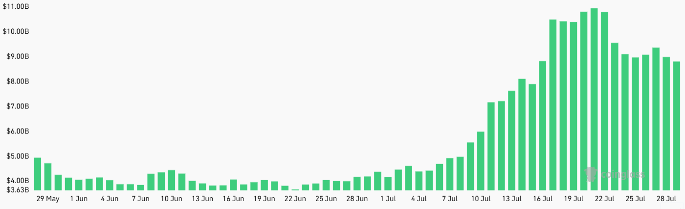 The chart above clearly shows that leverage fueled the 68.7% rally between July 1 and July 18, when XRP climbed to $3.66 from $2.17. Aggregate XRP futures open interest reached an all-time high of $11.2 billion on July 18, before falling to the current $8.8 billion level—a 21% drop in US dollar terms. This decline has prompted speculation that some investors may have shifted their focus elsewhere.