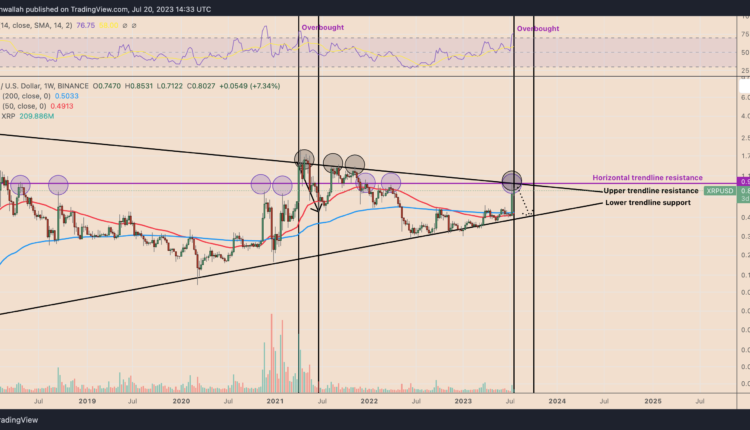 Overall, the resistance confluence, coupled with an overbought RSI, now raises XRP’s risks of a market correction. In this case, XRP price will likely fall toward the lower trendline support near $0.52 by September, down almost 40% from current price levels.
