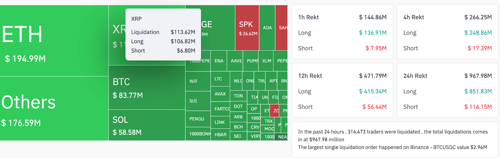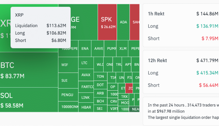 XRP leveraged positions saw $113.62 million liquidated, with $106.8 million accounting for long liquidations.