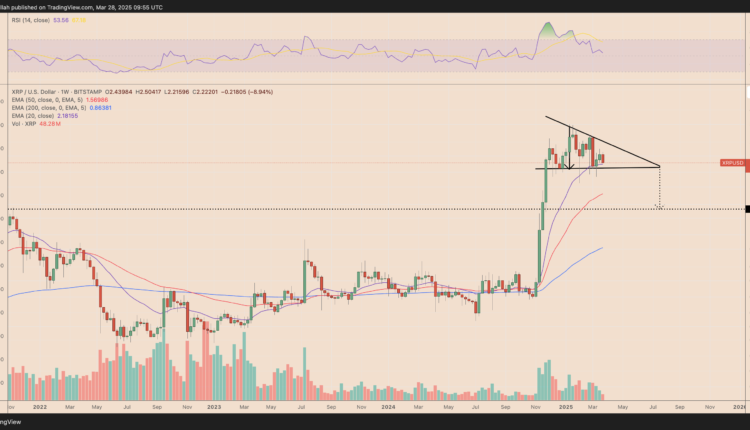 Since its late 2024 rally, the XRP price chart has been forming a potential triangle pattern on its weekly chart, characterized by a flat support level mixed with a downward-sloping resistance line.