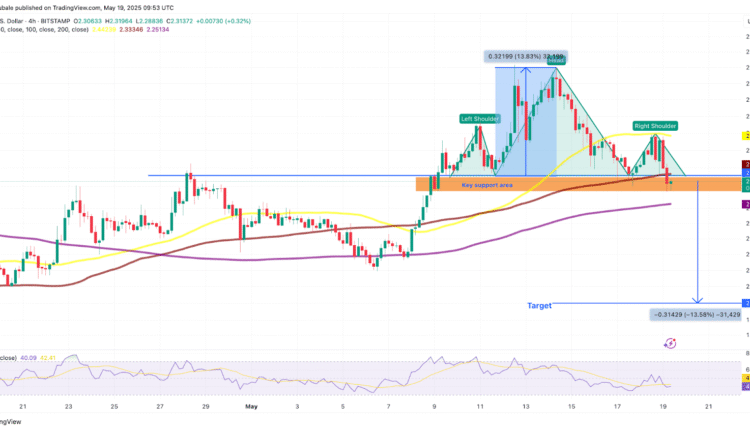XRP price action has formed a head-and-shoulders (H&S) pattern on its four-hour chart since May 9, projecting a likely down-move.