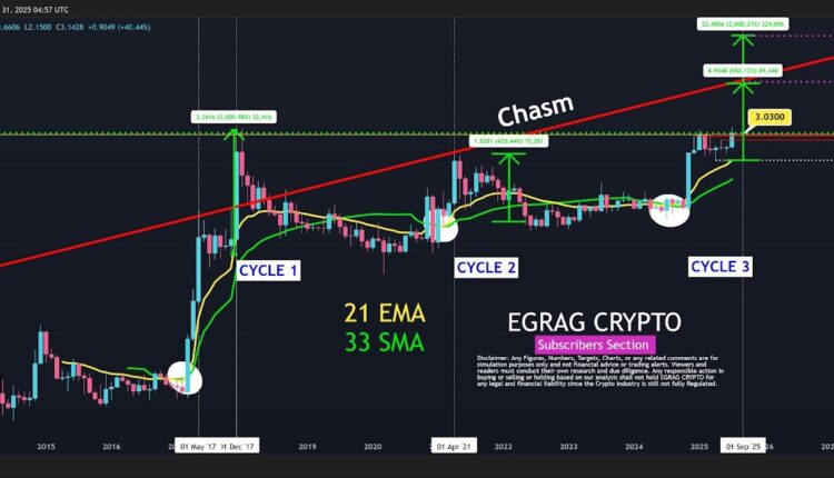 Touching “The Chasm” would put XRP’s initial target at $11, and surpassing it could trigger a rally up to $37, replicating historical patterns of parabolic growth.
