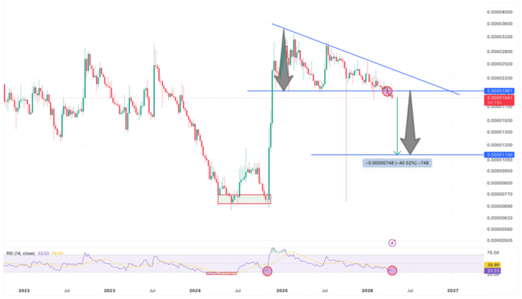 Using that method, the XRP/BTC pair’s measured downside target comes in near 0.000011 BTC, about 40.5% below current levels.