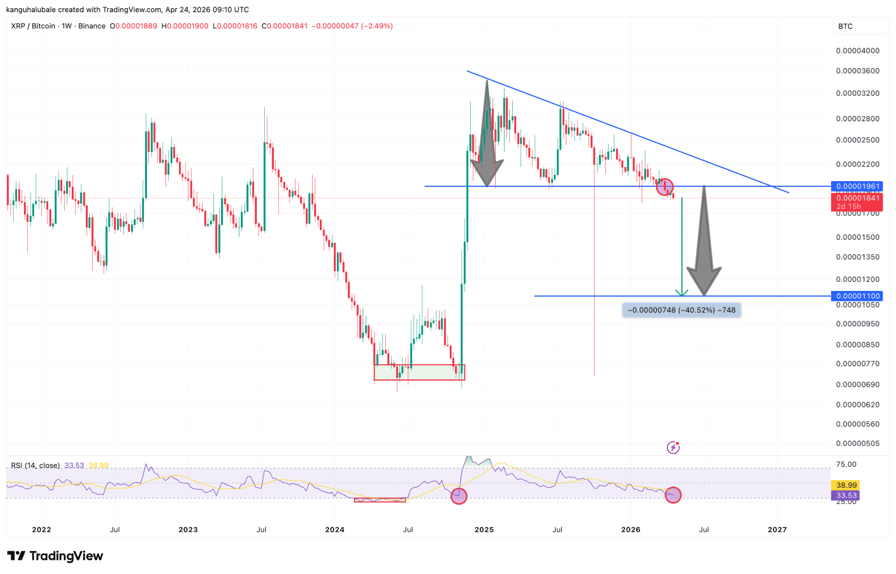 XRP (XRP) has fallen about 5% against Bitcoin (BTC) over the past week, and the confirmation of a bearish pattern now points to the risk of more losses ahead.