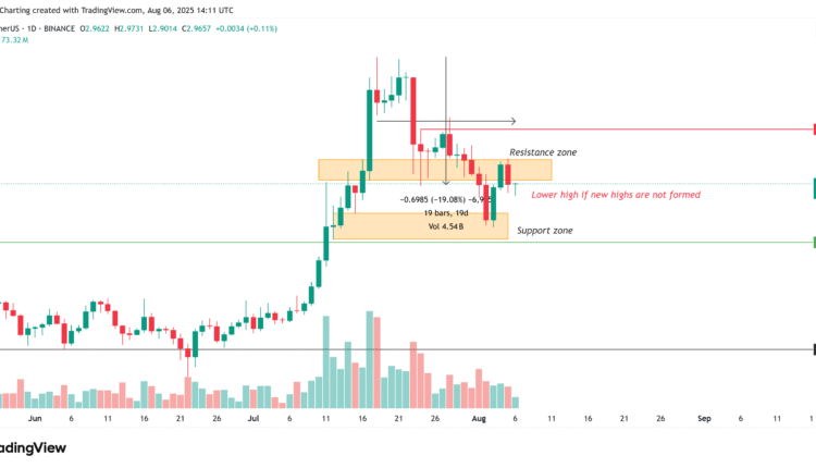 On Saturday, prices briefly dipped to a key support range between $2.66 and $2.80 before bouncing back on Sunday, forming a higher low.
