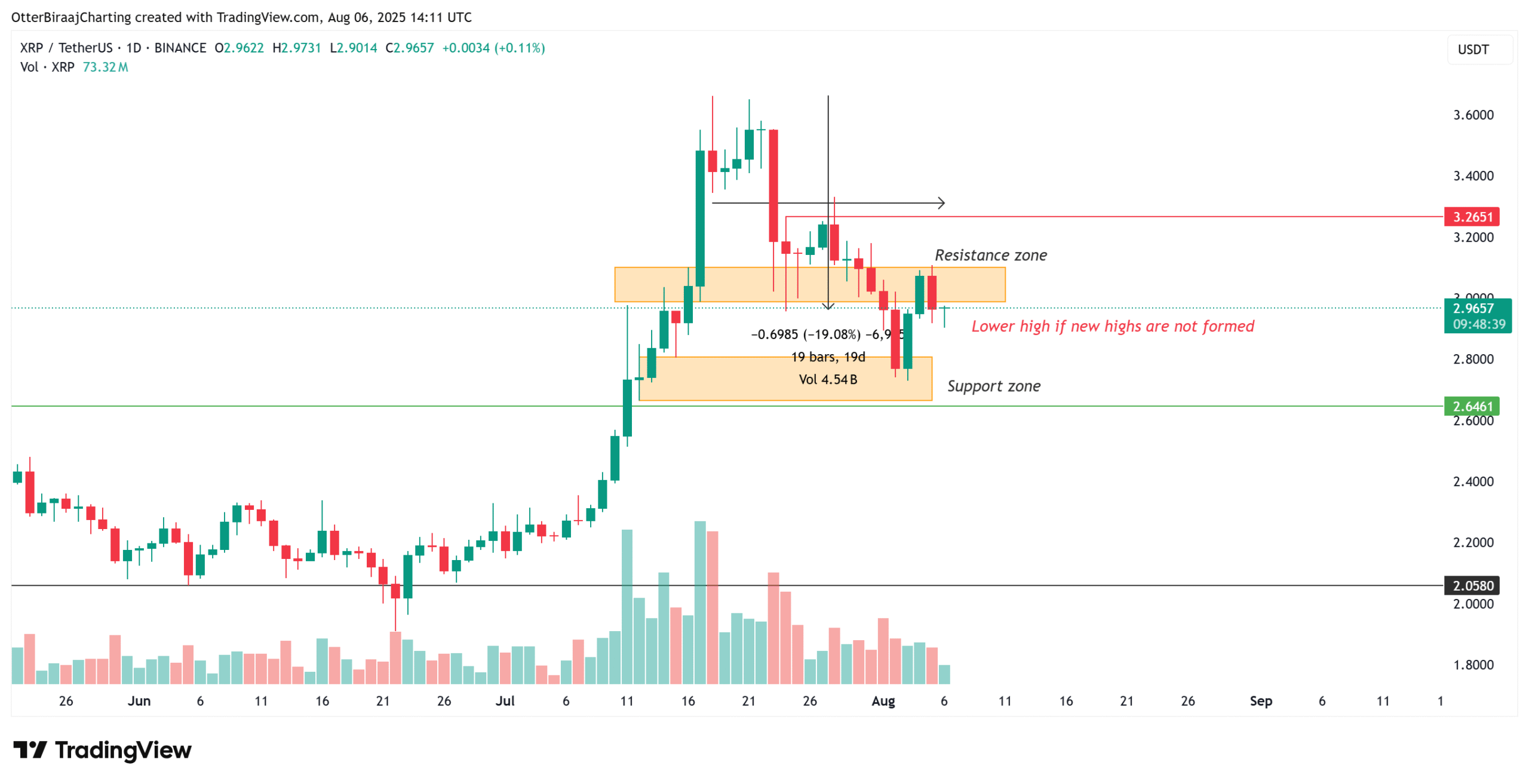 XRP (XRP) is undergoing a sharp correction after rallying to a yearly high of $3.65 on July 18. Since then, it’s down nearly 19%, struggling to reclaim the $3.10–$3.00 resistance zone.