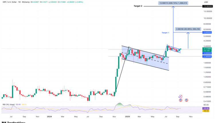 XRP confirmed the breakout in July in a rally that pushed the price toward nine-year highs above $3.66.
