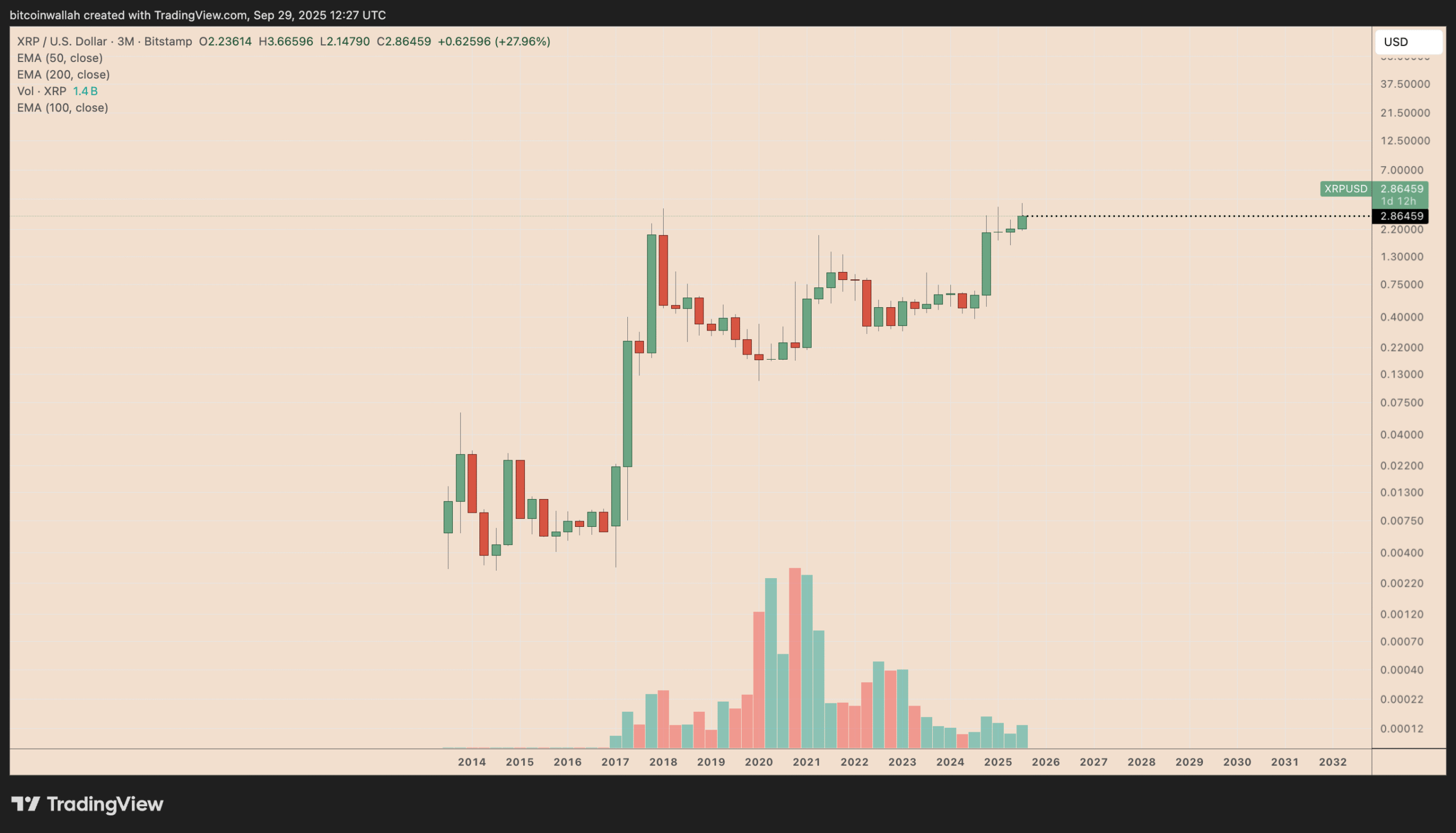 Back then, XRP ended Q4 2017 at a fresh quarterly close above $0.02, breaking through a multi-year resistance area. The move quickly snowballed into a parabolic rally, carrying the token to its all-time peak of nearly $3.31 within a year.