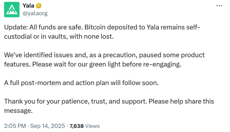 “Update: All funds are safe. Bitcoin deposited to Yala remains self-custodial or in vaults, with none lost,” the team wrote in their latest post on X. “We’ve identified issues and, as a precaution, paused some product features. Please wait for our green light before re-engaging,” they added.