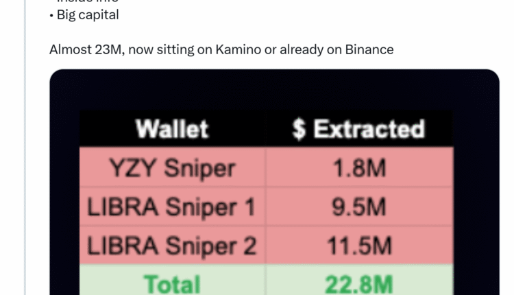 The same treasury wallet had also received large sums from wallets tied to LIBRA’s launch six months ago. Two “Libra sniper” wallets extracted a combined $21 million. In total, nearly $23 million was pulled across the YZY and LIBRA launches, with funds later moved to Kamino or Binance.