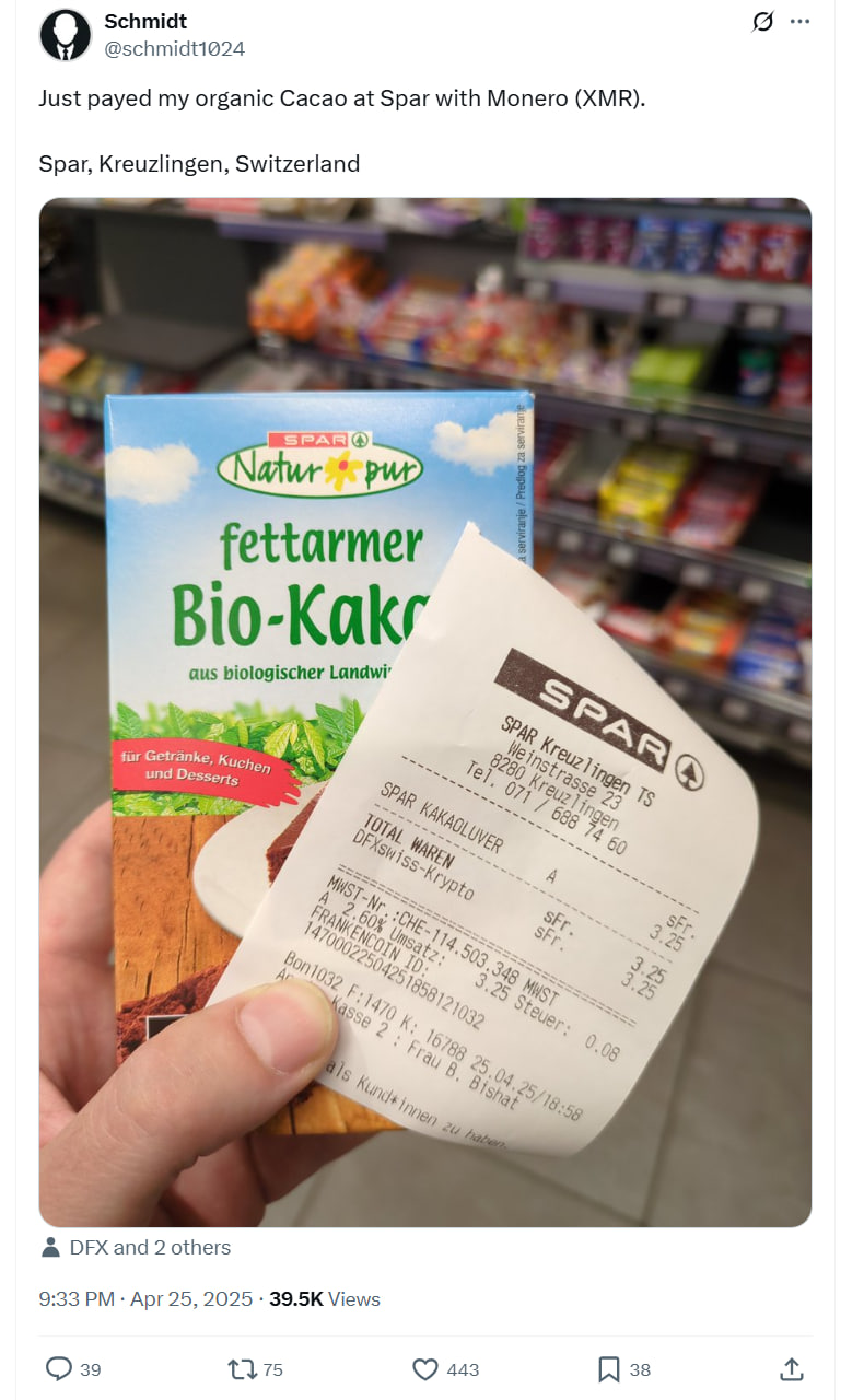 One user, posting on April 25, shared their experience of purchasing organic cacao using XMR at a Spar store in Kreuzlingen.