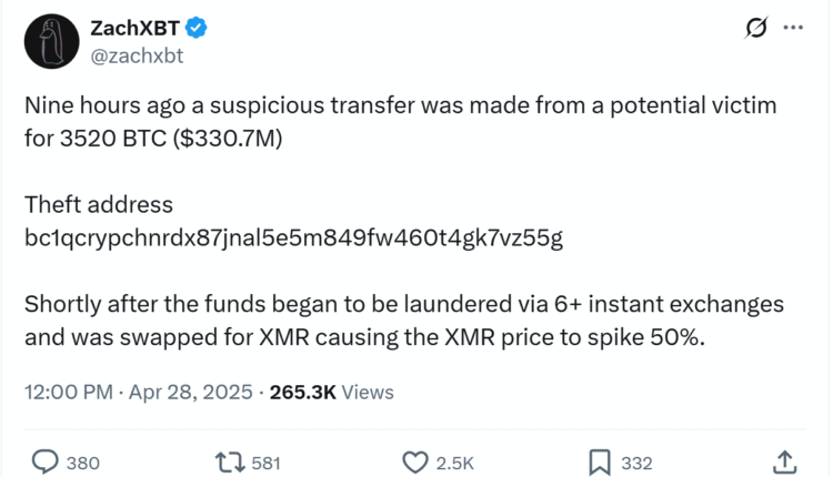 Onchain sleuth ZachXBT has flagged a suspicious transfer involving 3,520 Bitcoin (BTC) (valued at $330.7 million) that may indicate a major theft. The transaction, reported on April 28, saw funds moved from a potential victim’s wallet to the address bc1qcry…vz55g.