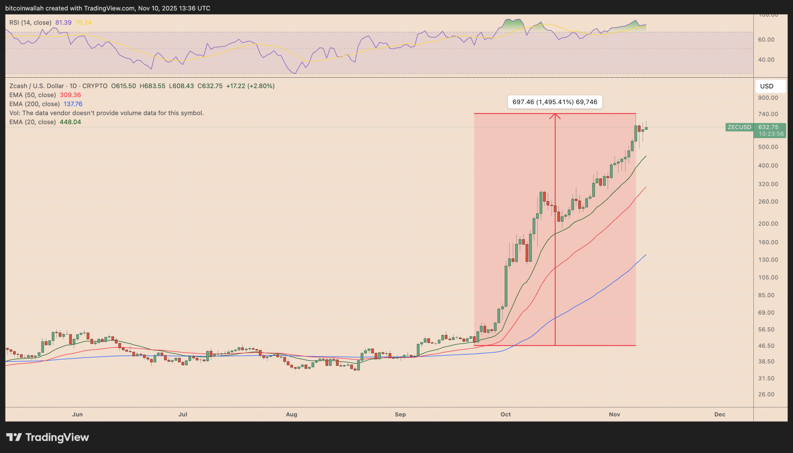 What makes the current rally unique is its duration. ZEC’s relative strength index, or RSI, has remained above 70 since late September, marking the most extended sustained period of overbought conditions in Zcash history.