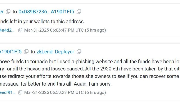 In a message sent to zkLend through Etherscan on March 31, the hacker claimed to have lost 2,930 Ether (ETH) from the stolen funds to a phishing website posing as a front-end for Tornado Cash.