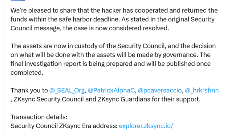 “We’re pleased to share that the hacker has cooperated and returned the funds within the safe harbor deadline,” ZKsync Association posted to X on April 23, which was later reposted by ZKsync’s X account.