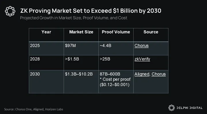 With a ZKP volume estimated at around $100 million and 4.4 billion proofs as of 2025, the ZK proving market is expected to reach $1.5 billion by 2030, according to data from leading industry platforms Chorus, Aligned and Horizen Labs.